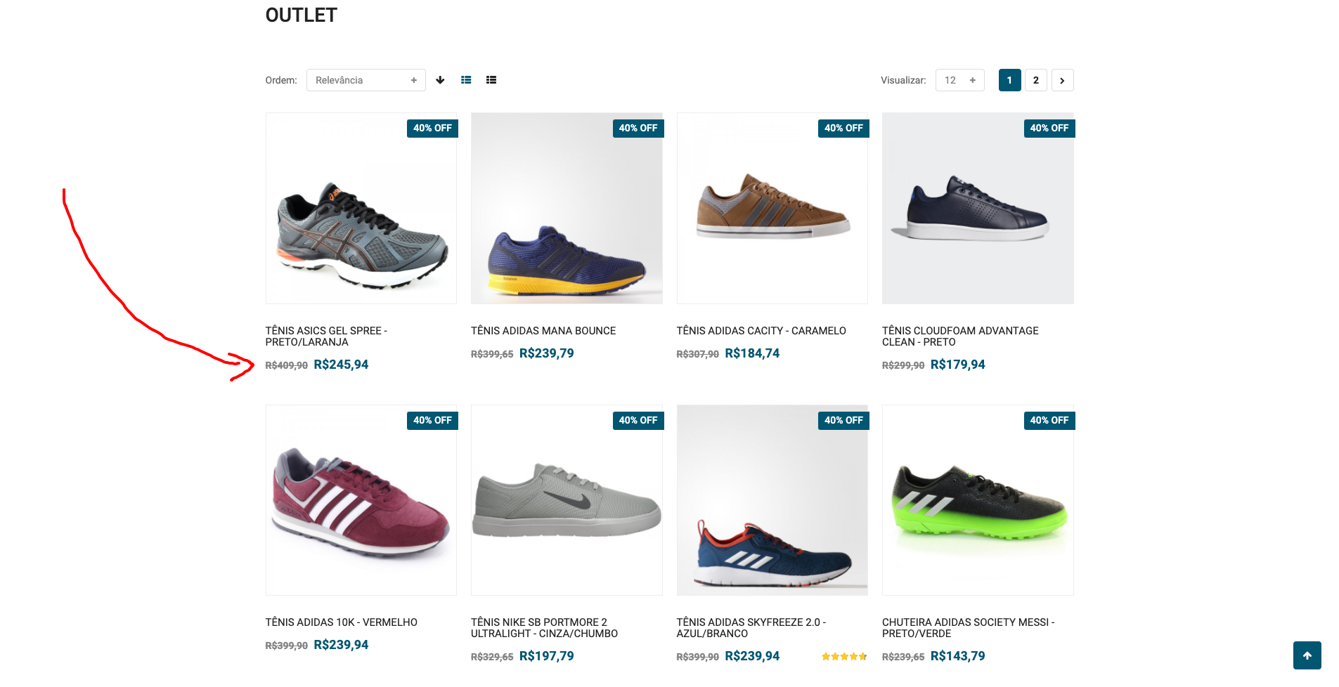 Um exemplo é a Regra de preços que aplica 40% de desconto nos itens da Categoria Outlet. Nesta opção o preço fica com aquele riscadinho clássico DE x POR y.