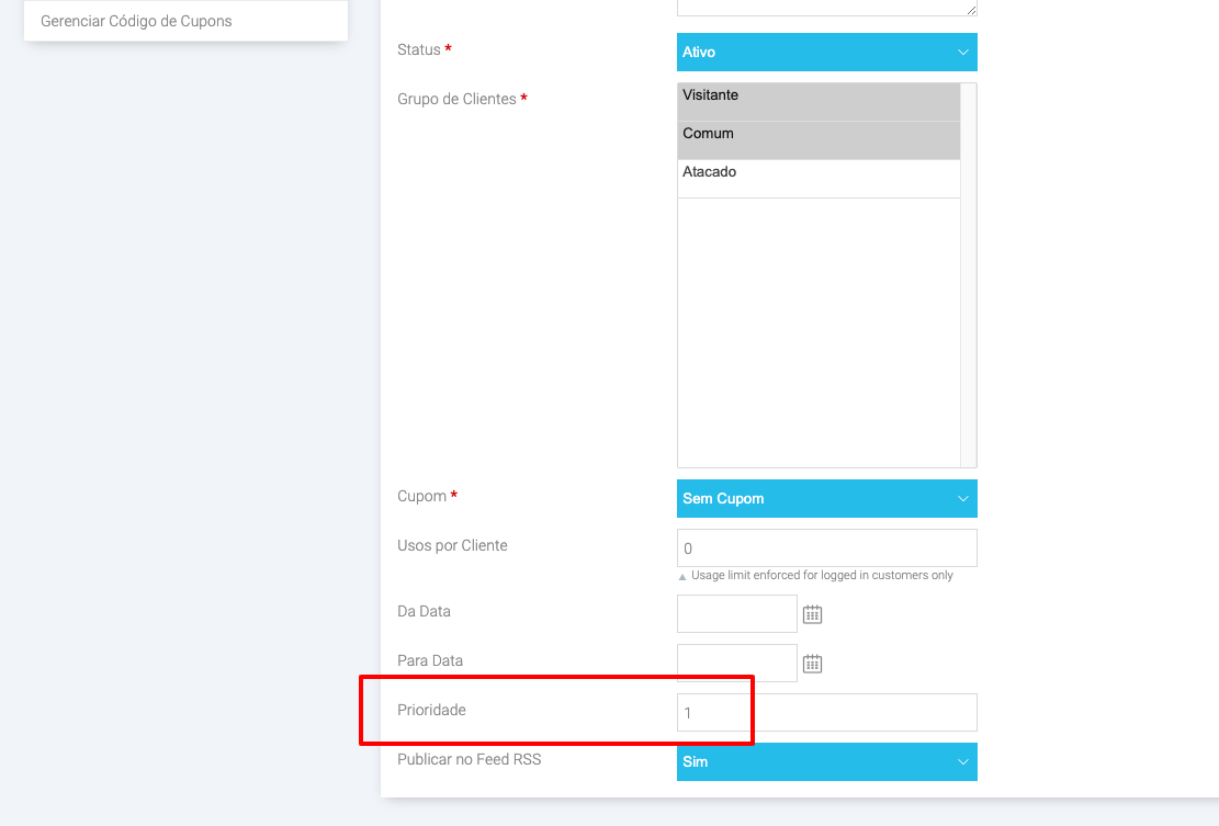 Este campo deve ser utilizado caso a loja virtual tenha outras regras ativas. A prioridade ajudará a plataforma a entender qual regra deverá ser aplicada primeiro caso o cliente tenha acesso a mais de uma regra no carrinho de compras. Caso a sua loja virtual não tenha regras que possam ser aplicadas a uma mesma compra, não é necessário preencher este campo.
