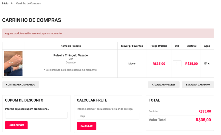 E se o cliente adicionou um item ao carrinho e este se esgota antes dele finalizar a compra? Nesse caso, uma mensagem será mostrada informando que o produto não está mais disponível. Dessa forma, o cliente precisará remover esse item para poder concluir o pedido.